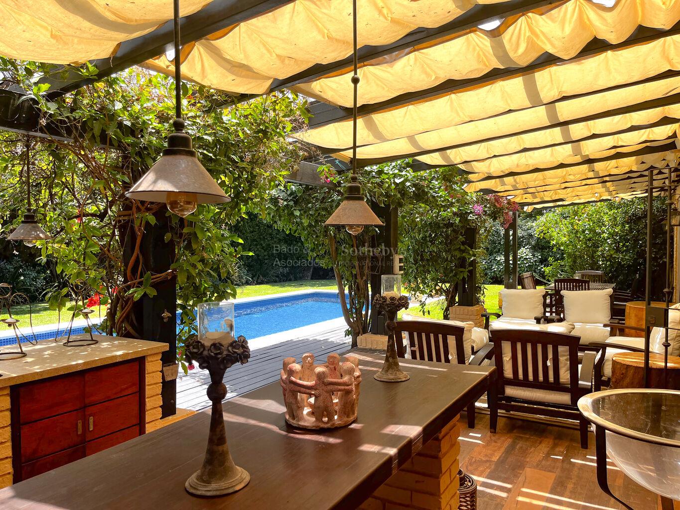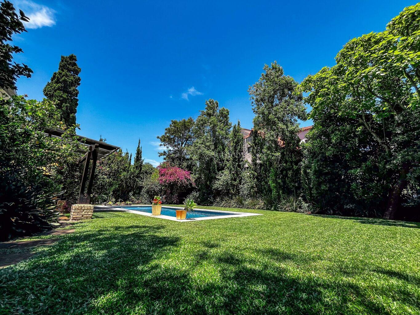 Opening onto the garden, a **pergola-covered terrace** invites outdoor living and relaxation, overlooking the **swimming pool**, the centerpiece of a serene green setting.