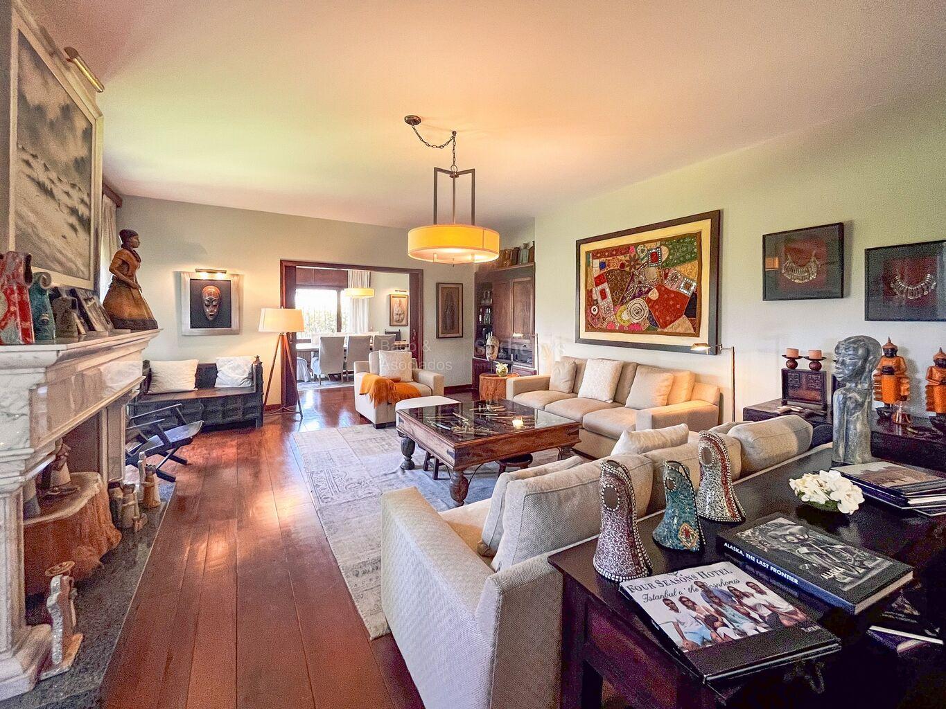 The **living room with wood-burning fireplace**, the **separate dining room**, and the **study** create an elegant social area designed for both living and entertaining. A **large family room with fireplace/barbecue** adds warmth and versatility, complemented by a **guest toilette**.