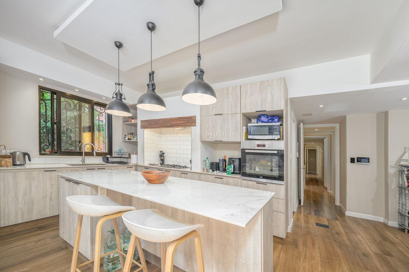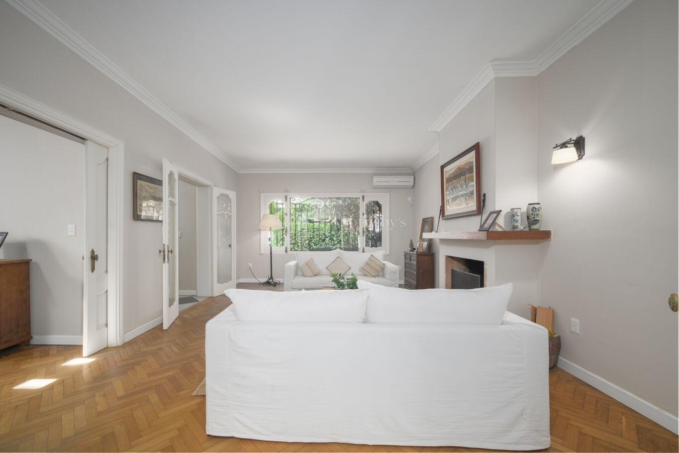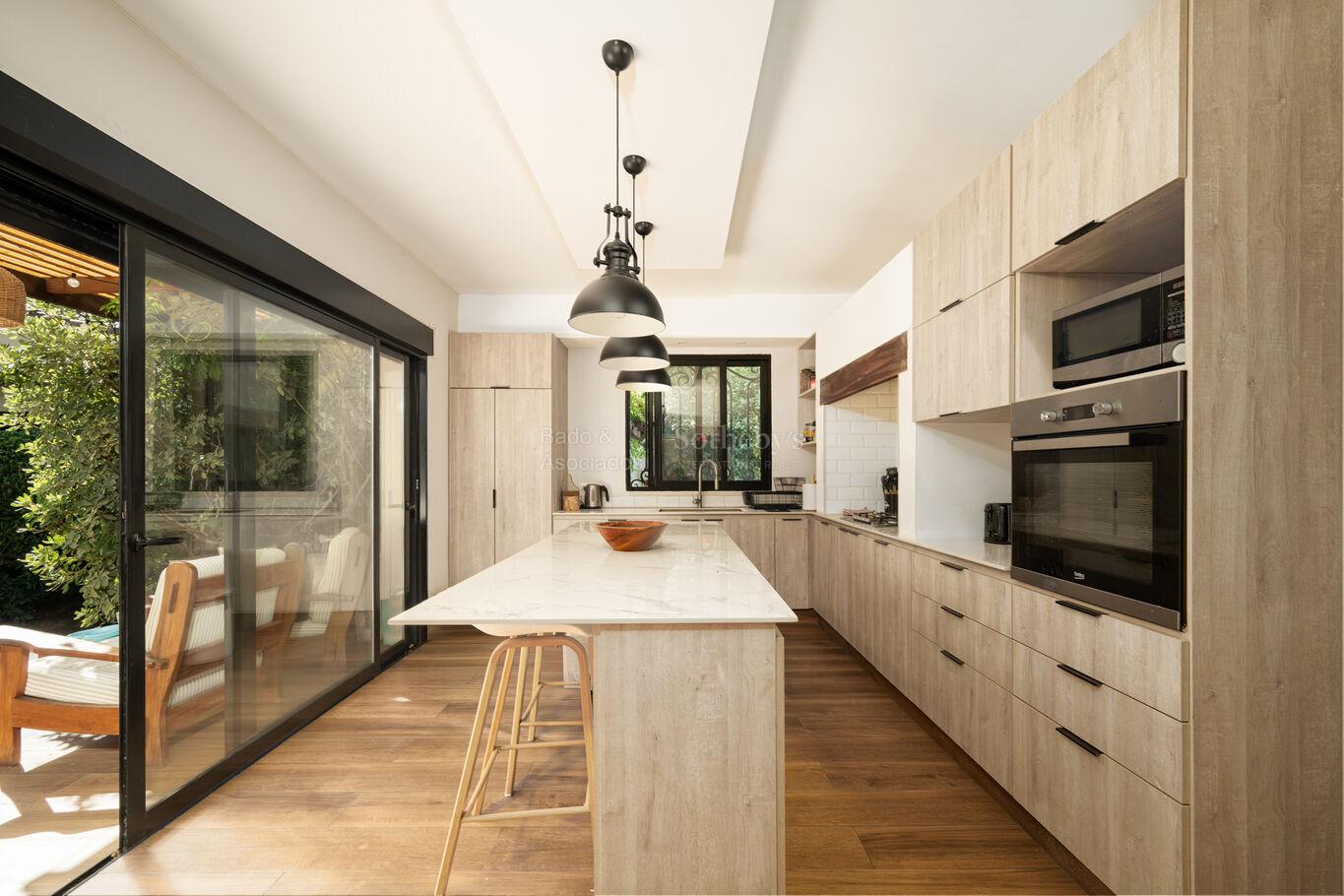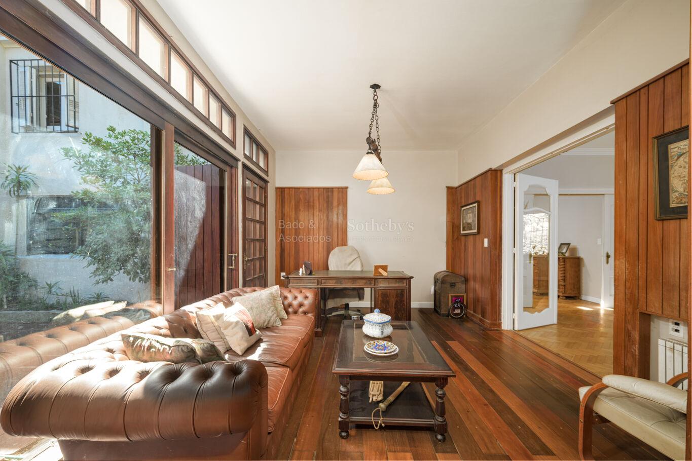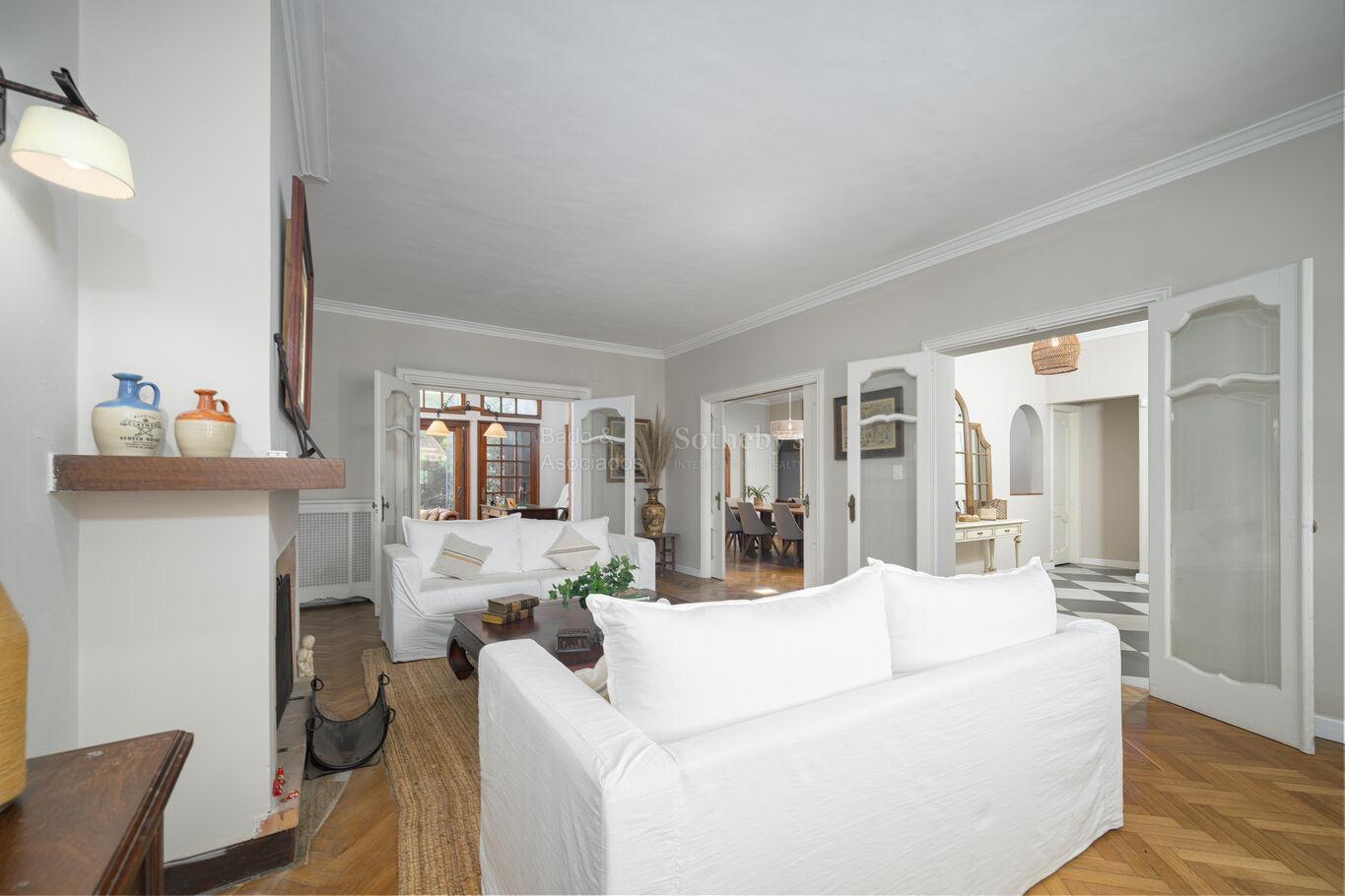 La planta baja recibe a través de una amplia y elegante recepción que conduce a los principales ambientes sociales: un luminoso living, comedor formal definido y un amplio escritorio, ideal para home office o biblioteca. Un confortable estar familiar con cocina integrada articula la vida cotidiana con vistas abiertas hacia el jardín. En este nivel se disponen además tres dormitorios y tres baños, configurando una planta versátil tanto para uso familiar como para huéspedes.
