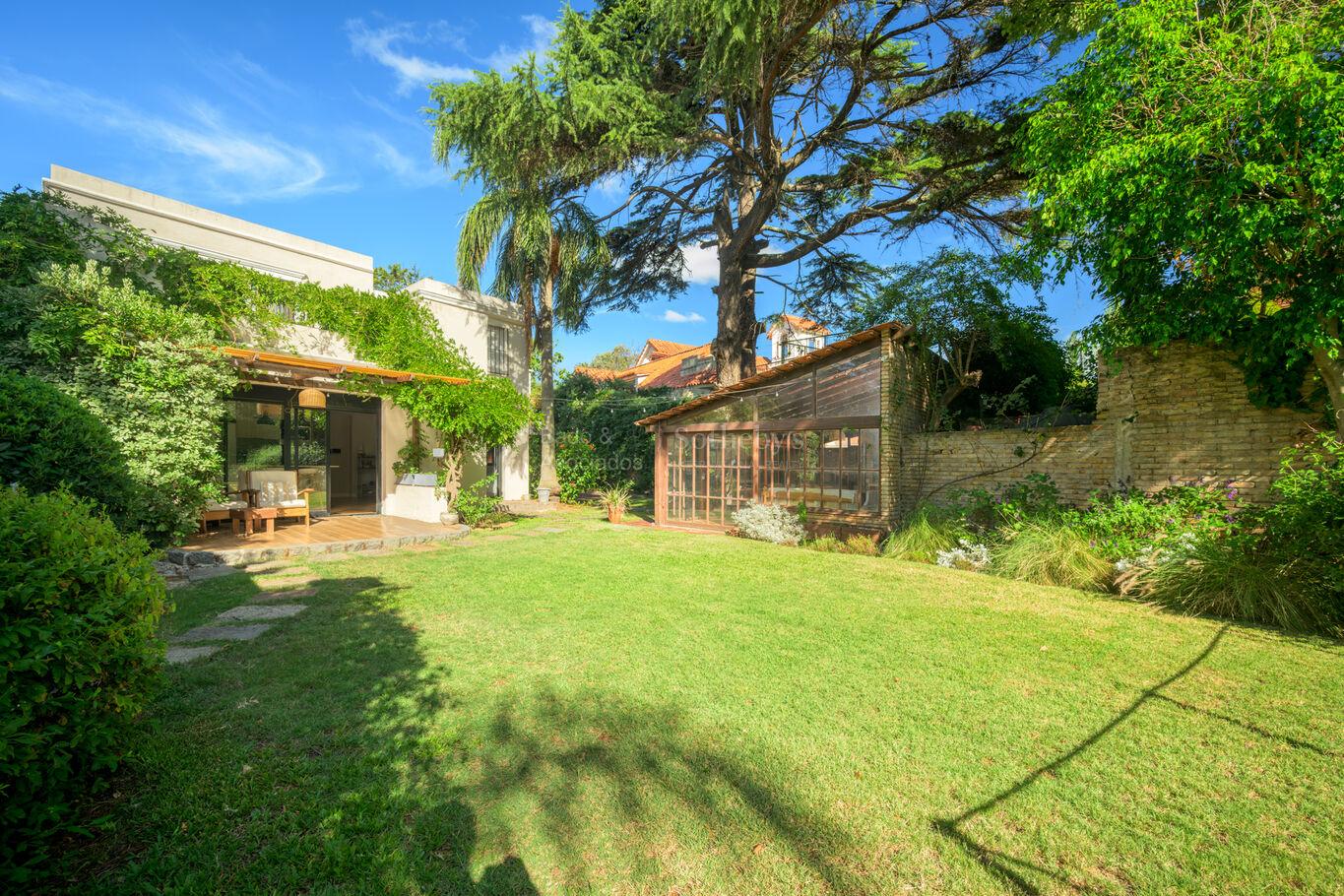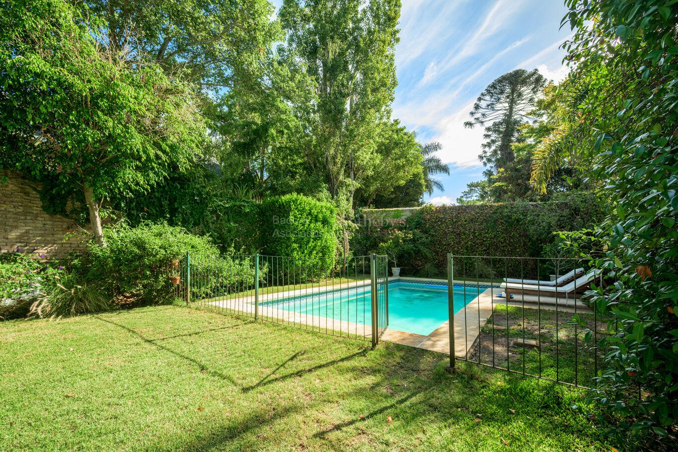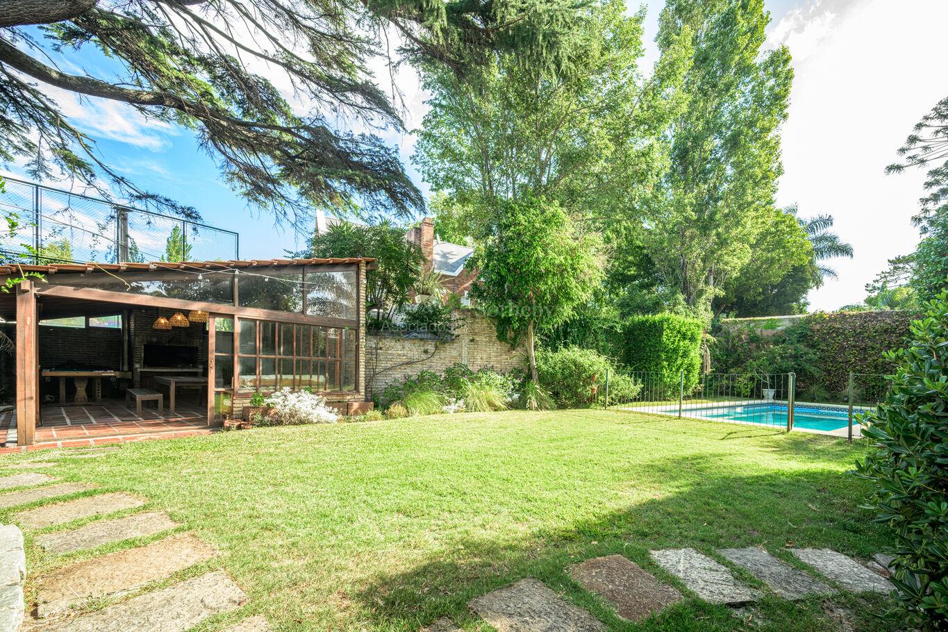 El exterior constituye uno de los grandes atributos de la propiedad: un jardín arbolado de excelente escala, con riego automático y óptima orientación solar, enmarca una piscina rodeada de verde que garantiza privacidad y disfrute durante todo el año. Completa el sector una barbacoa techada ideal para reuniones sociales y una casa de servicio independiente con dormitorio y baño.