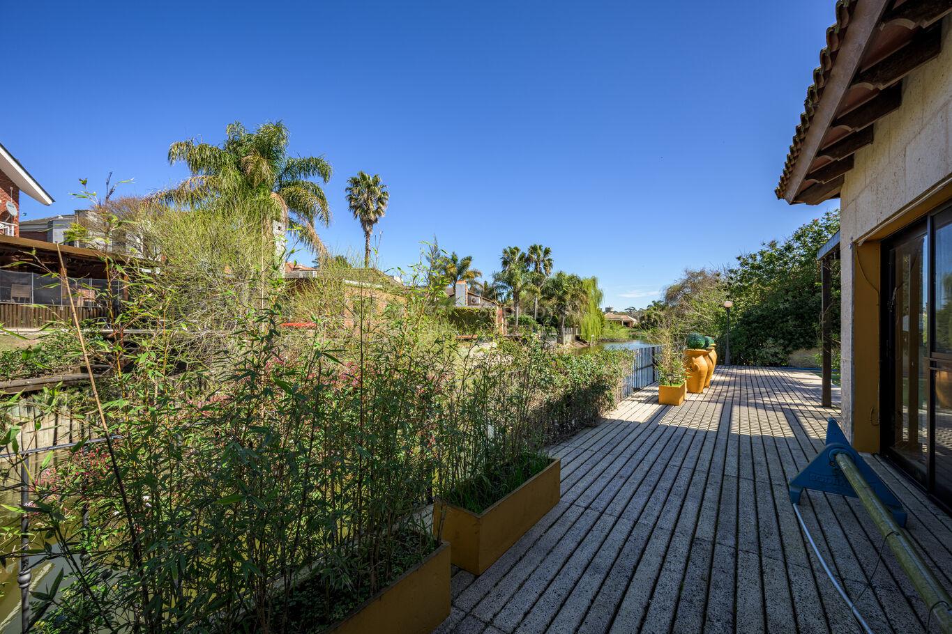 El exterior fue pensado para disfrutar: barbacoa con barra y baño con ducha orientada al lago, y piscina cuyo perímetro está 100% cubierto por deck atérmico. El acceso vehicular resulta práctico con doble entrada y circulación, garaje para 2 autos y cochera para 1.